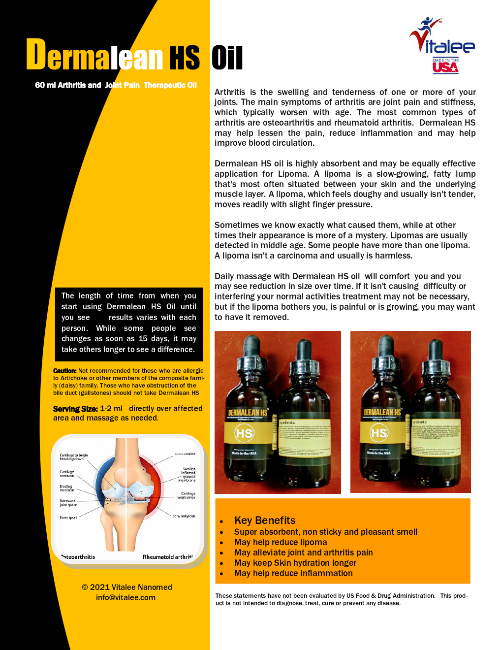 Dermalean HS is a highly absorbent oil that not only serves as an effective arthritis pain relief cream but also functions as a joint pain relief cream, offering benefits for various conditions, including lipoma. When applied to affected areas, Dermalean HS works quickly to penetrate the skin, targeting inflammation and pain at the source. Its powerful ingredients are known for their anti-inflammatory and analgesic properties, helping to soothe aching joints and improve mobility.